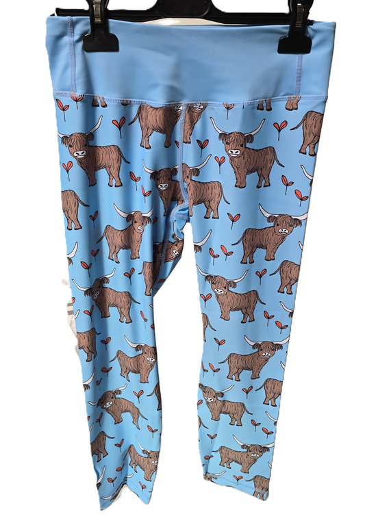 Last Chance - Highland Cow on Blue Women's Active Leggings - Waistband Pocket